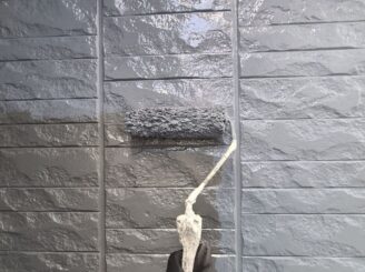 【外壁塗装 中塗り上塗り】中塗りと上塗りは同様の塗料を使用します。メーカー仕様の塗布量や塗り重ね乾燥時間を遵守し、施工していきます。