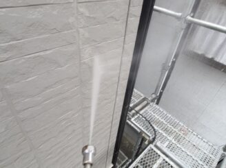 【外壁 高圧洗浄】高圧洗浄にて苔・藻・カビ等の汚れを洗い落とします。