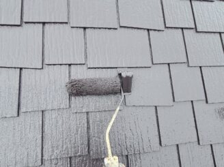 【屋根 中塗り、上塗り】中塗りと上塗りは同様の塗料を使用します。メーカー仕様の塗布量や塗り重ね乾燥時間を遵守し、施工していきます。