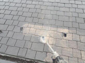 【屋根 高圧洗浄】高圧洗浄にて苔・藻・カビ等の汚れを洗い落とします。