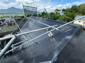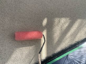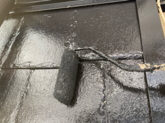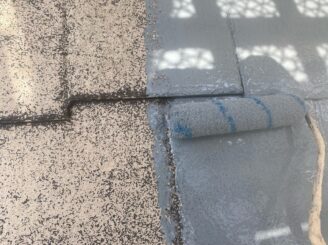 【屋根 中塗り上塗り】 中塗りと上塗りは同様の塗料を使用します。メーカー仕様の塗布量や塗り重ね乾燥時間を遵守し、施工していきます。