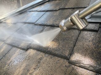 【屋根 高圧洗浄】高圧洗浄にて苔・藻・カビ等の汚れを洗い落とします。