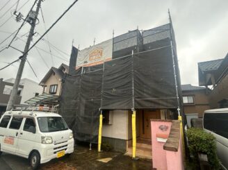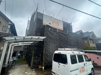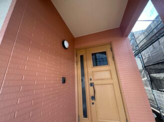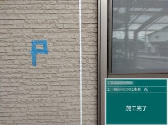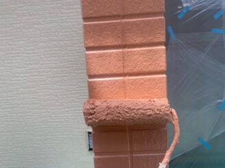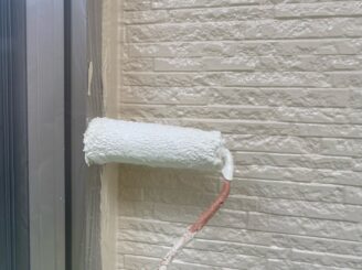 【外壁塗装 中塗り上塗り】中塗り上塗り同様の塗料を使用します。メーカー仕様の塗布量や塗り重ね乾燥時間を遵守し、施工していきます。